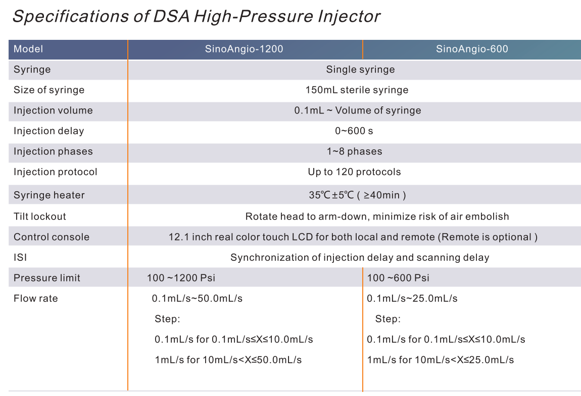 SinoAngio-1200 is a model of injector for digital substraction angiography machine.It is considered as a reliable friend of the cath lab,and faciliate the angiogram procedure in large degree.Injection pressure limit up to 1200psi.It mainly features: